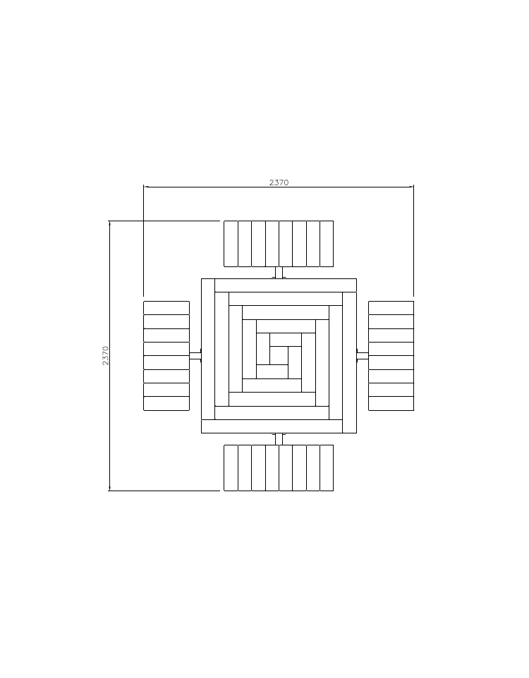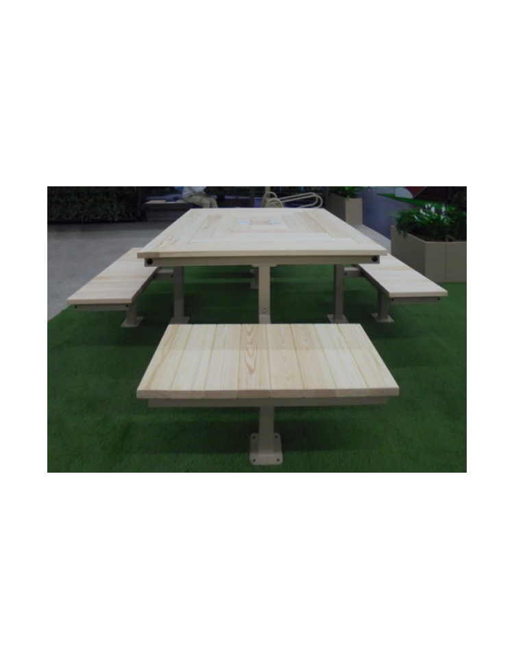 Set composto da un tavolo quadrato e quattro panchine piane. Il set è composto da una struttura in acciaio zincato e successivamente verniciata a polveri epossidiche formata da tre supporti in tubolare quadro collegati al piano del tavolo tramite viti. Ai fianchi vengono saldate 6 piastre con fori per il fissaggio al suolo tramite tasselli, la struttura montata diventa corpo unico per evitare che gli utenti spostino a piacere gli elementi. La seduta ed il piano del tavolo sono composti da doghe in legno di pregio. Set adatto anche per le persone diversamente abili.
