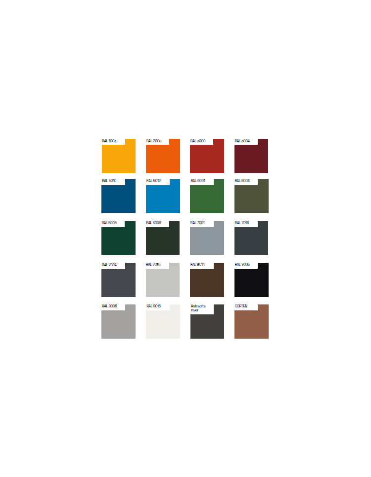 Tutte le parti metalliche sono zincate e verniciate a polveri termoindurenti nelle diverse colorazioni RAL.