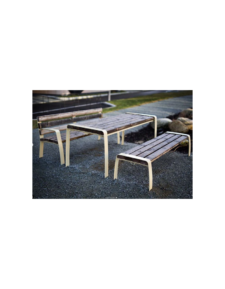 Set con struttura portante in acciaio zincato e verniciato nelle varie colorazioni RAL. I fianchi del tavolo e delle panchine sono costituiti da supporti in piatto rinforzati da un profilo tagliato a laser sui quali sono saldate le piastre base per poter fissare la struttura al suolo con tasselli ad espansione. Nella parte superiore dei supporti sono saldate le piastre dove sono fissate le doghe in legno. La seduta ed il piano del tavolo sono formati da doghe in legno di pregio trattato per l'esterno. Per dare stabilità alla seduta centralmente è fissato tramite viti un tirante di rinforzo. La viteria è interamente in acciaio inox.