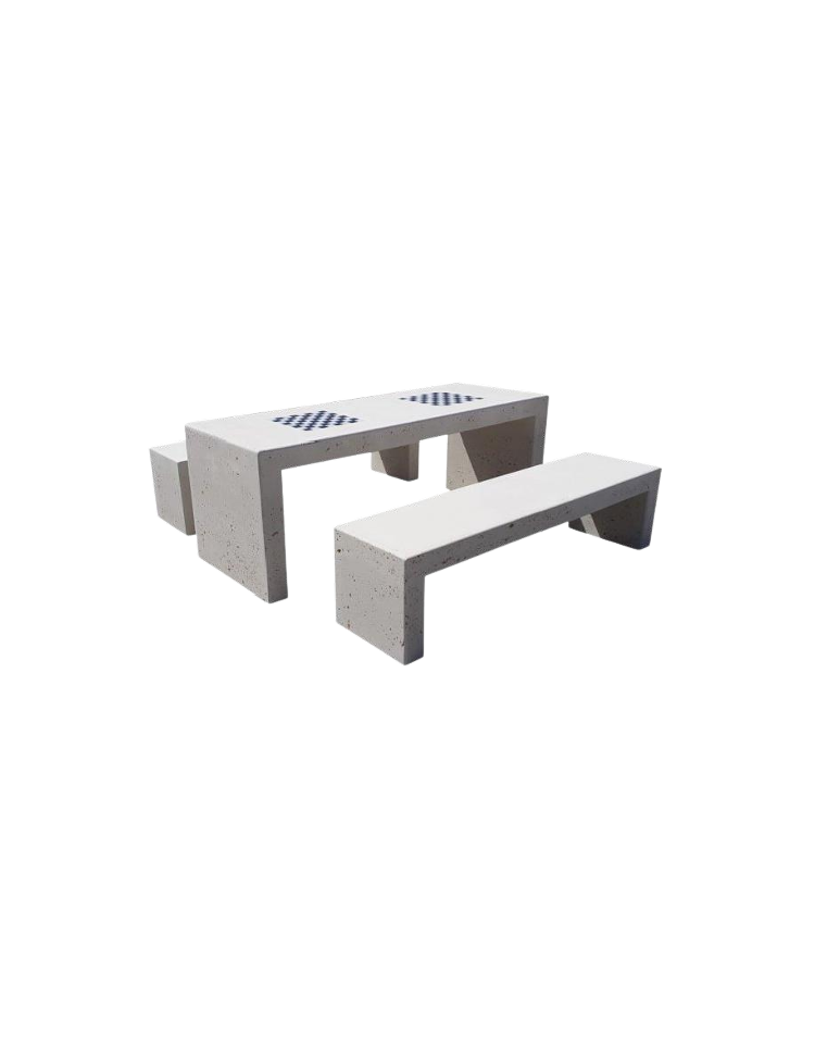 Composto da un tavolo rettangolare monoblocco e due panchine senza schienale monoblocco.