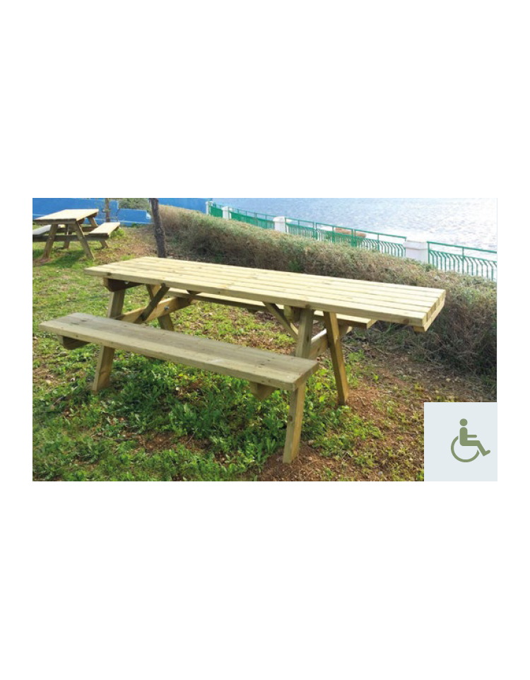 Gruppo tavolo e 2 panche per pic-nic di grande robustezza realizzato in legno di conifera nordica impregnata in autoclave. Tutto il materiale è in legno di conifera nordica impregnato in autoclave trattato in superficie con una mano di impregnate trasparente e finitura idrorepellente all’acqua. Viene fornito parzialmente preassemblato.