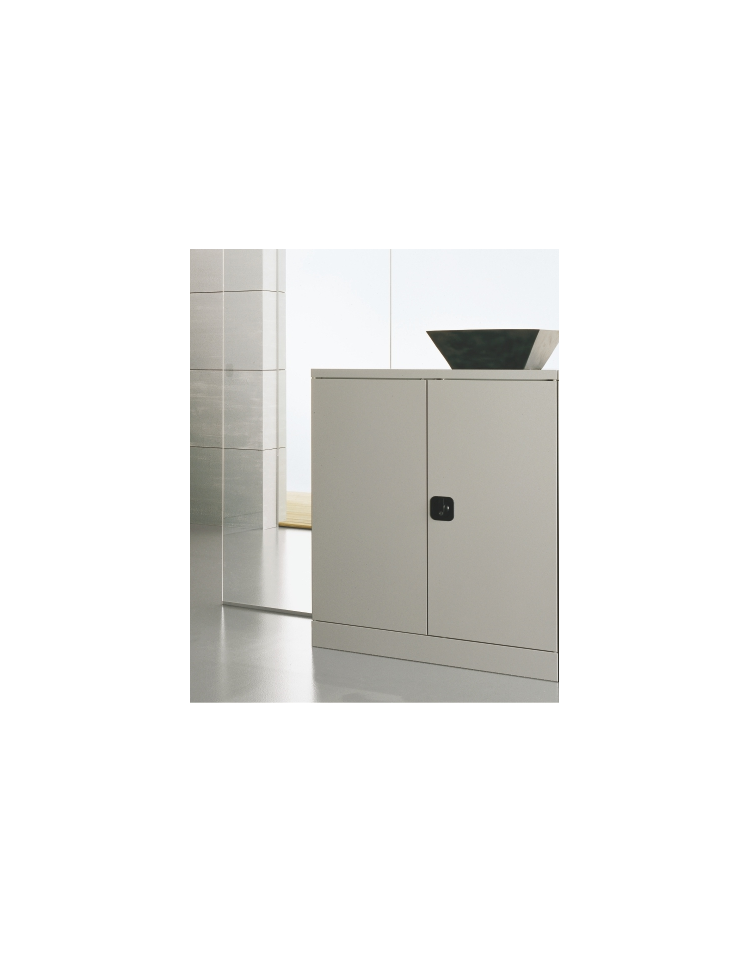 Realizzato con lamiera d'acciaio di 1° scelta con spessore 8/10 mm con particolari di assemblaggio spessore 15/10 mm. Le ante a battente sono dotate di una serratura/maniglia a “timone” che, ruotando, permette a 2 aste metalliche di muoversi verticalmente in direzione opposta agganciandosi nel cappello e nella base del sopralzo. All'interno vi sono 4 ripiani spostabili predisposti per l'applicazione di cartelle sospese a lettura verticale, interasse 33 cm. Lo spostamento avviene su cremagliera con passo 30 mm. I fianchi hanno gli spigoli esterni arrotondati raggio 8 mm. E sono incastrati alla base mediante 4+4 ganci metallici ricavati con lo stampaggio della lamiera (spessore 20/10) mentre il cappello è fissato ai fianchi mediante 4 bulloni filettati 8MA. I fianchi sia anteriormente che posteriormente sono tutti raggio 8 mm. e gli spigoli del cappello sono completamente arrotondati. Le schiene sono fissate alla struttura dell'armadio con viti autofilettanti, in modo da garantire la massima rigidità, esse sono posizionabili sia con faccia a vista esterna sia con faccia a vista interna. La verniciatura viene effettuata con polveri epossidiche in forno a 190° C previo trattamento anti corrosione.