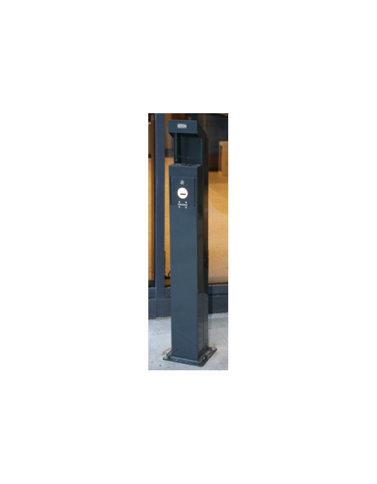 Lo spegnisigarette è costituito da una struttura in tubolare di acciaio. Frontalmente sul tubolare è ricavata una apertura nella quale è inserita una griglia in lamiera forata che funge da piano spegnisigarette. All’interno del tubolare si trova un contenitore a cassetto con estrazione nella parte anteriore tramite lo sblocco di una serratura con chiave universale che permette di rimuovere uno sportello di chiusura. La colonna in tubolare è chiusa sulla parte superiore con un tappo in lamiera saldato e la base è costituita da una piastra quadra che può essere fissata al suolo tramite tasselli ad espansione. Tutte le parti metalliche sono zincate secondo norme UNI e verniciate a polveri poliestere termoindurenti nelle diverse colorazioni RAL.