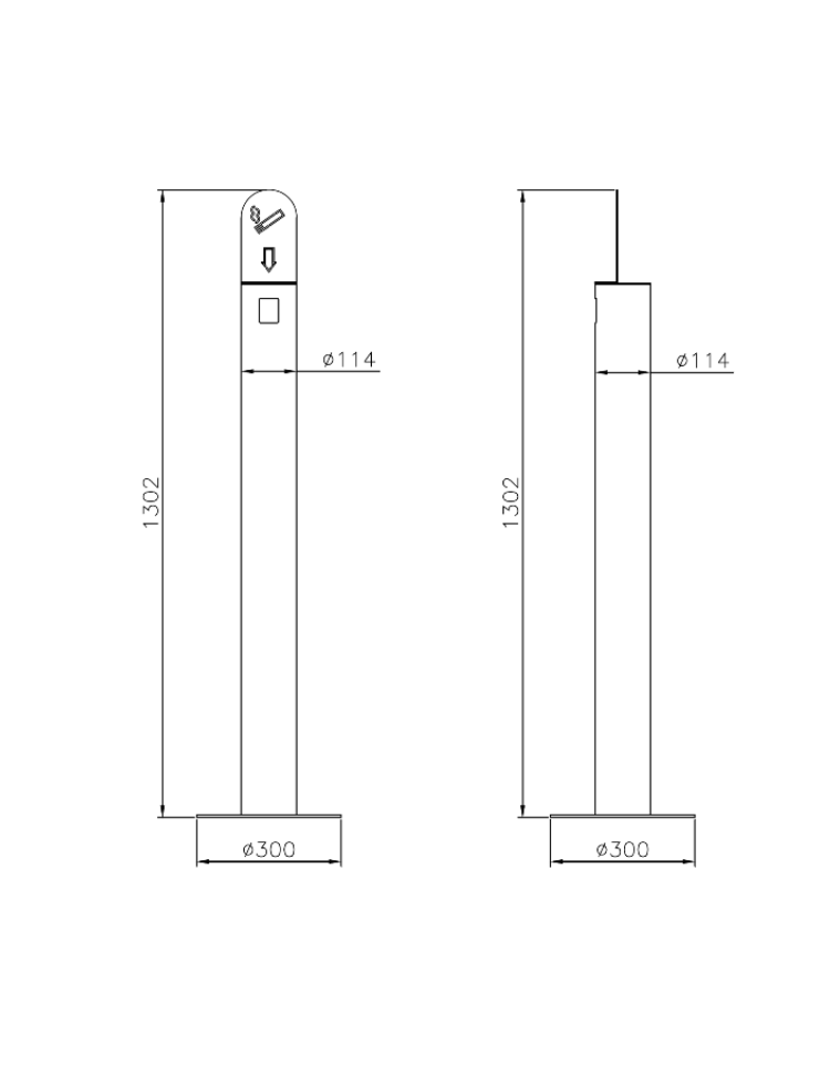 Spegni sigarette realizzato completamente in acciaio zincato e verniciato. È costituito da un tubolare provvisto di una apertura frontale di forma rettangolare per l’introduzione delle sigarette e da un contenitore interno in acciaio nel quale viene ricavato anche il filtro ignifugo per permettere lo spegnimento della sigaretta. Il tubolare viene saldato alla flangia base per il fissaggio al suolo con tasselli ad espansione. Il coperchio con il logo della sigaretta è di facile pulizia e può essere rimosso dal tubo principale con l’apertura della serratura universale posta sul retro del coperchio per permettere l’estrazione del contenitore interno.