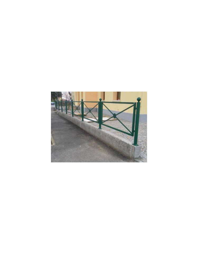 La barriera è composta da due sostegni in tubolare di acciaio Ø 80x2 con sovrastante borchia Ø40 e sfera in acciaio forgiato Ø90mm. La pannellatura viene unita ai sostegni con viteria in acciaio inox, composta da un telaio perimetrale L.825XH.825 o L.1825XH.825 mm in tubolare quadro 40x1,5 e crociera in piatto 30x10, con nodo centrale costituito da un piatto Ø152 sp.10mm. Il pannello a croce può essere rivestito con un pannello in lamiera 12/10 su cui può essere affissa la pubblicità.