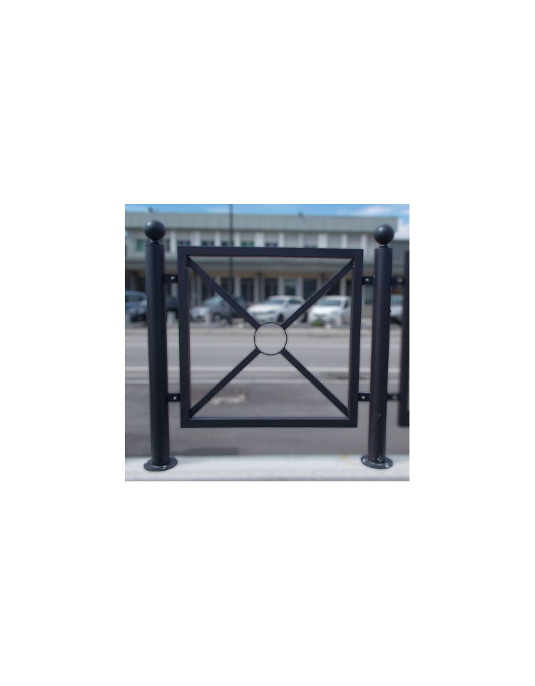 La barriera è composta da due sostegni in tubolare di acciaio Ø80x2 con sovrastante borchia Ø40 e sfera in acciaio forgiato Ø90mm. La pannellatura è unita ai sostegni con viteria in acciaio inox ed è composta da un telaio perimetrale L.825XH.825 o L.1825XH.825 mm in tubolare quadro 40x1,5 e da una crociera in piatto 30x10 con nodo centrale costituito da un anello tondo Ø152 sp.10mm. La barriera può essere fornita modulare o singola. Tutte le parti metalliche sono zincate e verniciate a polveri poliestere termoindurenti secondo le diverse colorazioni RAL. Può essere sia da inghisare che da tassellare (con basi quadre 150x150 sp.5mm o tonde D.150 mm sp.5mm provviste di n.4 fori per tasselli ad espansione per il fissaggio al suolo) ed il pannello a croce può essere rivestito con un pannello in lamiera 12/10 su cui può essere affissa la pubblicità. Usata a protezione di marciapiedi vicino agli incroci o per piste ciclabili, interne o esterne all’area urbana.