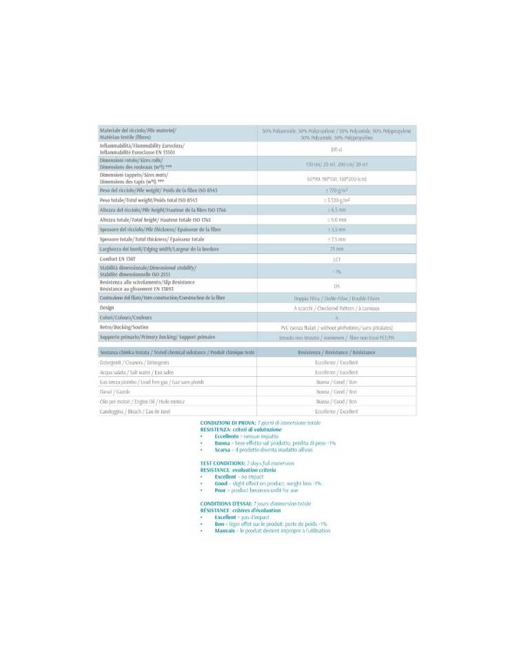 E’ un tappeto per ingressi a medio traffico dotato di elevata capacità di assorbenza dell’acqua e di eccellenti caratteristiche di rimozione dello sporco. Presenta una trama a doppia fibra realizzata con fibre sottili in polipropilene (50%) ad elevata assorbenza, lavorate a ricciolo, e fibre spesse in poliammide 6 (50%), efficaci nel rimuovere lo sporco. Le fibre sottili e spesse sono legate ad una base in non-tessuto in poliestere e poliammide 6. Il supporto antiscivolo , realizzato in resistente PVC senza ftalati, offre eccellenti proprietà antisdrucciolo su diversi tipi di pavimentazione. I bordi del supporto sono progettati per consentire un passaggio sicuro.