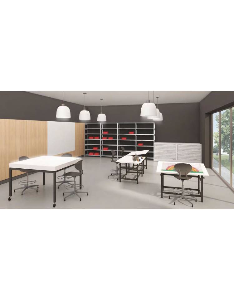 La conformazione della struttura rende i tavoli da disegno Architetto particolarmente adatti al disegno tecnico e alle attività di laboratorio, con piani di lavoro di grande, medio e piccolo formato. I piani da disegno sono realizzati in truciolare nobilitato melamminico di colore bianco con finitura opaca adatta al disegno. Lo spessore è di 18 mm.