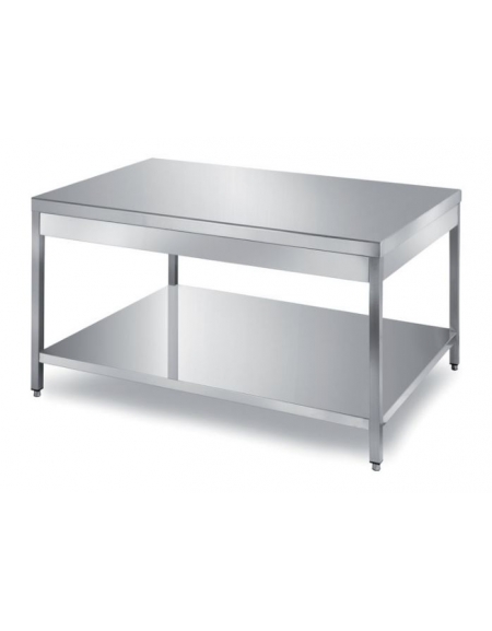 TAVOLO INOX AISI 304 CON 1 RIPIANO INFERIORE, ANGOLO RAGGIATO SU 1 FRONTE, BORDO H 60 MM - CM. 140X80X87H