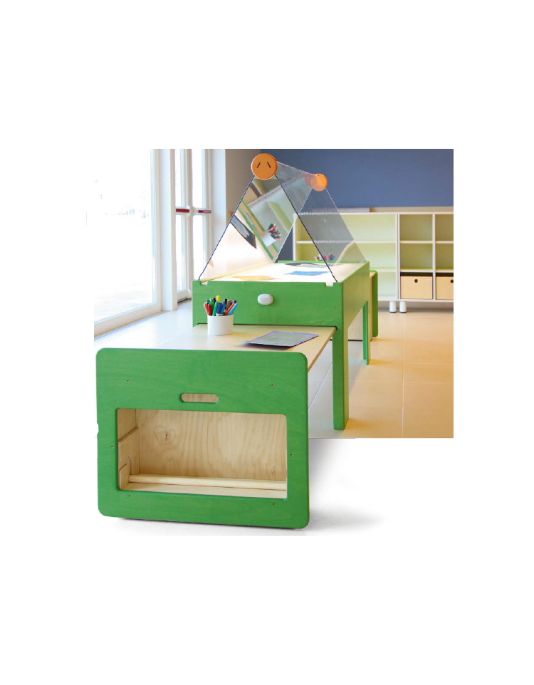 Una superficie di luce per sperimentare trasparenze, per guardare dentro le cose e i materiali: il tavolo luminoso offre ai bambini infinite occasioni di conoscenza, di gioco, di creatività. I piani, estraibili a piacere, aumentano lo spazio di lavoro. Il sopralzo è un supporto trasparente e riflettente, per composizioni e collage.