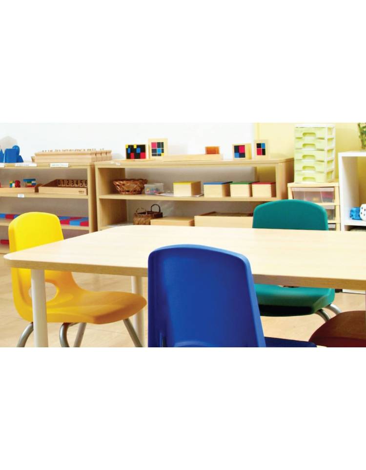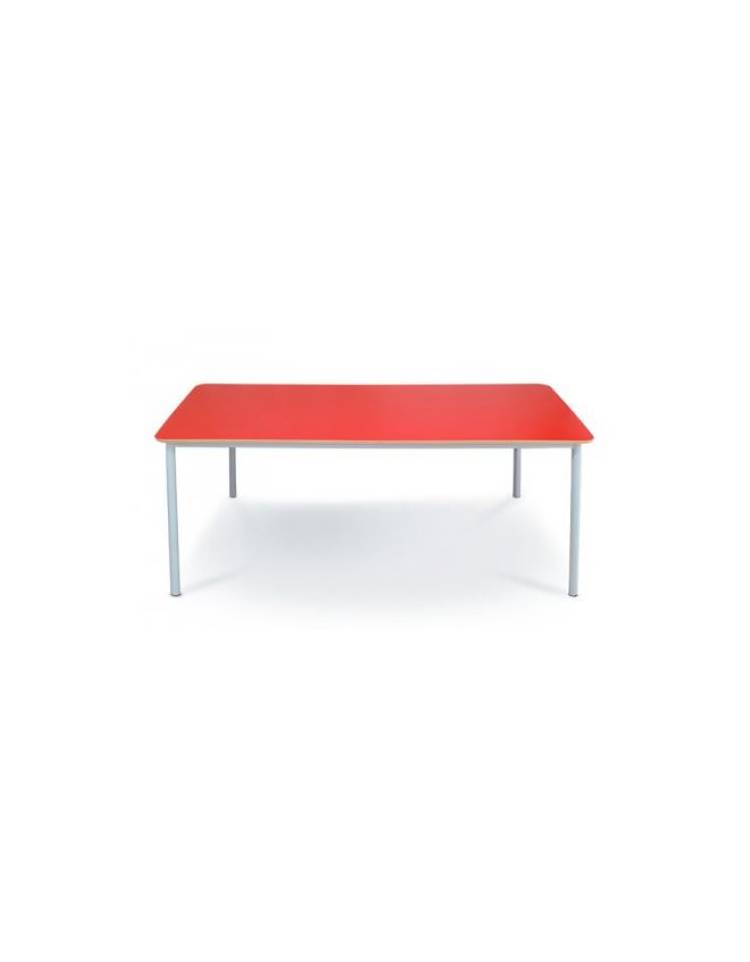 Struttura portante formata da quattro gambe verticali in tubolare da mm. 40x1,5 a cui sono saldate di testa le barre di collegamento perimetrali in tubo da mm. 40x20x1,5. Saldatura a filo continuo.Verniciatura eseguita, previa preparazione del sottofondo mediante degrassaggio e fosfatazione, con polveri epossidiche polimerizzate in galleria termica a 220° per 1 spessore di 60 micron. Piano in pannello melaminico fibrolegnoso E1 da mm. 18 con finitura antigraffio. Bordatura perimetrale del piano in ABS 15/10 finitura faggio, con spigoli arrotondati. Agli appoggi puntali in plastica ad alette inestraibili