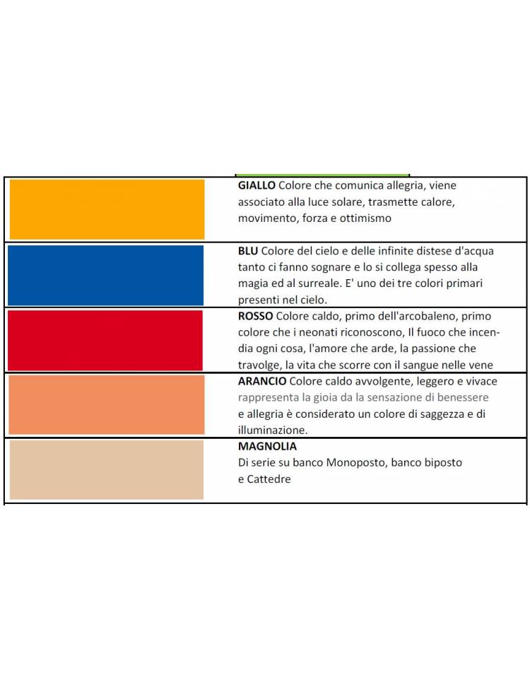 Struttura portante formata da quattro gambe verticali in tubolare da mm. 40x1,5 a cui sono saldate di testa le barre di collegamento perimetrali in tubo da mm. 40x20x1,5. Saldatura a filo continuo.Verniciatura eseguita, previa preparazione del sottofondo mediante degrassaggio e fosfatazione, con polveri epossidiche polimerizzate in galleria termica a 220° per 1 spessore di 60 micron. Piano in pannello melaminico fibrolegnoso E1 da mm. 18 con finitura antigraffio. Bordatura perimetrale del piano in ABS 15/10 finitura faggio, con spigoli arrotondati. Agli appoggi puntali in plastica ad alette inestraibili