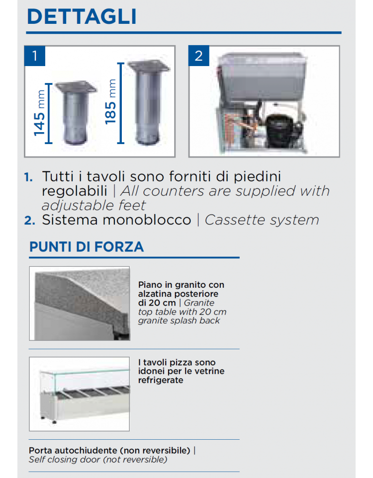 Progettato per offrire un’attrezzatura professionale affidabile per le pizzerie, questo banco frigo offre un solido piano di lavoro in granito e rappresenta la soluzione perfetta per la conservazione di impasti ed ingredienti. Questo modello, con profondità 800 mm, è dotato di top in granito con alzatina da 200 mm, 2 vani refrigerati con ripiani regolabili 600x400mm e guide a “C”. Il nostro banco pizza è predisposto per il montaggio di unità portaingredienti con top in vetro o in acciaio inox richiudibile.