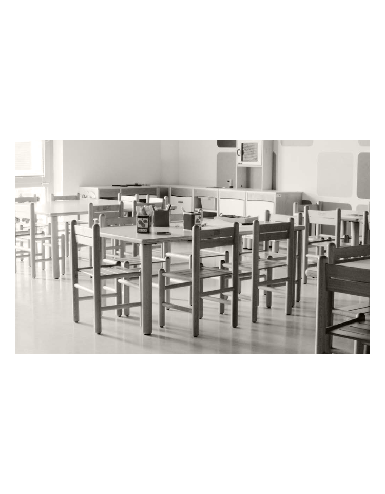 Le gambe dei tavoli sono in massello di faggio, fissate direttamente al piano per evitare l’ingombro di fasce sottopiano. I tavoli hanno diverse geometrie, ma a parità di altezza sono perfettamente complanari e accessibili su tutti i lati, per consentire le più diverse attività. I bordi sono arrotondati e le viti non sono sporgenti. Le sedie, coordinate ai tavoli per altezza, sono disponibili sia in legno sia in plastica con struttura in metallo.