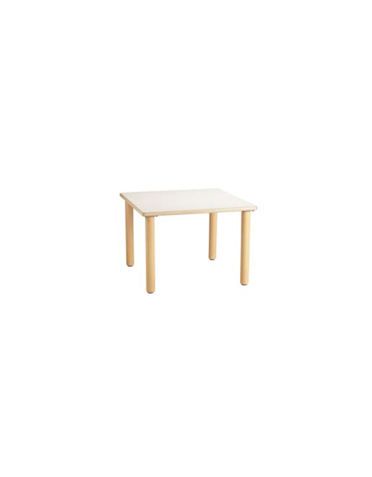 Tavolo mensa e tavolo multiuso quadrato realizzato con struttura portante in tubolare di acciaio trafilato UNI EN 10305-03/03 con gambe Ø mm.60 collegate perimetralmente da quattro traverse a sezione rettangolare da mm.30x15 mediante saldature a filo continuo ad alta resistenza meccanica, verniciatura a polveri epossipoliesteri termoindurenti. Piano di lavoro in agglomerato di particelle fibrolegnose ricoperto su ambedue le superfici in laminato plastico melaminico con finitura antigraffio nello spessore complessivo di mm.20. Bordatura perimetrale in faggio massello a sezione raggiata. Avvitatura alla struttura portante mediante speciali viti ad ala larga con testa incassata in idoneo incavo ricavato sulla parete del tubo. Puntali alettati e inestraibili alle estremità.