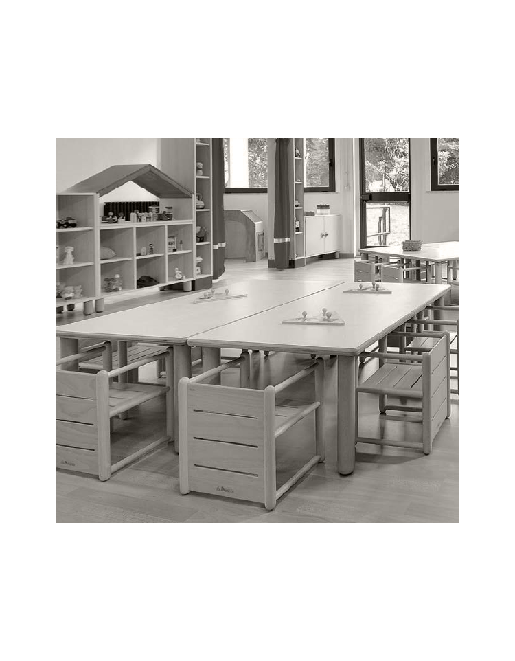 Le gambe dei tavoli sono in massello di faggio, fissate direttamente al piano per evitare l’ingombro di fasce sottopiano. I tavoli hanno diverse geometrie, ma a parità di altezza sono perfettamente complanari e accessibili su tutti i lati, per consentire le più diverse attività. I bordi sono arrotondati e le viti non sono sporgenti. Le sedie, coordinate ai tavoli per altezza, sono disponibili sia in legno sia in plastica con struttura in metallo. I seggioloni possono essere alloggiati sotto il tavolo, le loro gambe non si intralciano tra loro.