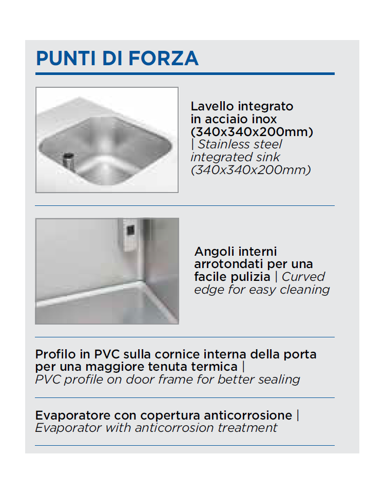 Pratica soluzione che integra l’affidabilità del nostro banco frigo con un lavello in acciaio inox (340x340x200mm), questo modello rappresenta la perfetta combinazione tra efficienza e ottimizzazione degli spazi, con 700mm di profondità, 2 porte, termostato digitale, gas refrigerante eco-friendly R290 e piedini regolabili in altezza (da 135mm a 185mm).
