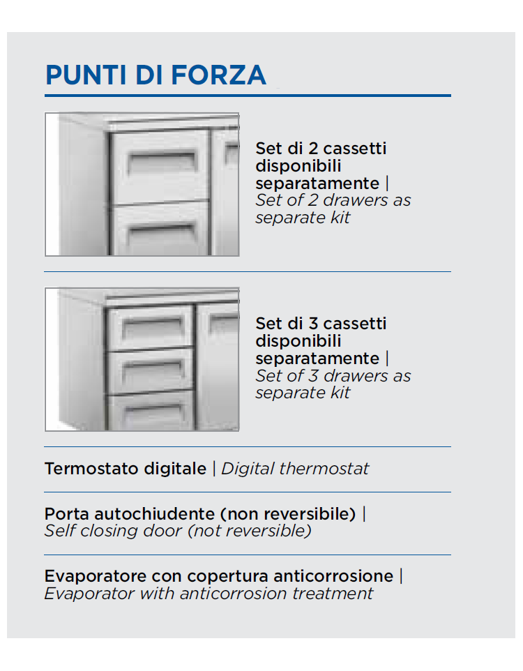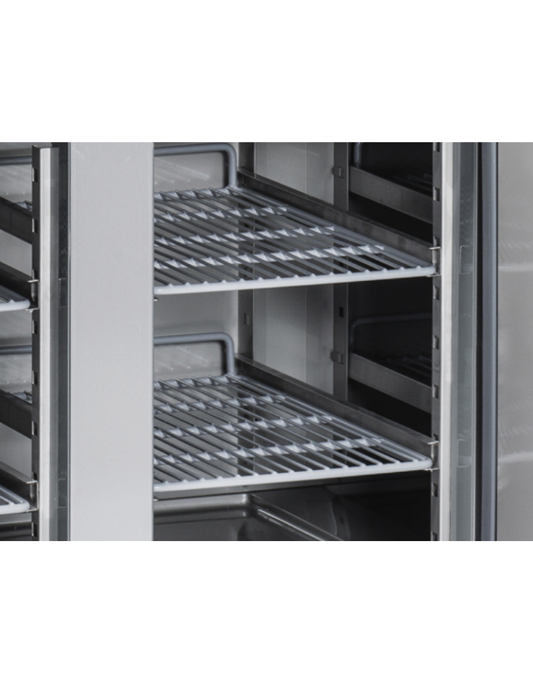 Tavolo refrigerato dall’aspetto moderno, con nuovo design della porta, top con bordi arrotondati e display digitale. Questo modello rappresenta la perfetta combinazione tra efficienza e affidabilità, con 600mm di profondità, 4 porte e 2 ripiani regolabili 325x410mm per ogni vano (cassettiere opzionabili). Il nostro banco frigo è stato progettato con attenzione all’ambiente e al risparmio energetico, equipaggiato con gas refrigerante eco-friendly R290, schiumatura isolante da 60 mm su ciascun lato, porte autochiudenti con spessore maggiorato e sagomatura interna per una migliore tenuta termica ed evitare sprechi di energia. Piedini regolabili in altezza (da 145 mm a 185 mm) contribuiscono a rendere questo prodotto un’attrezzatura ideale per la ristorazione professionale.