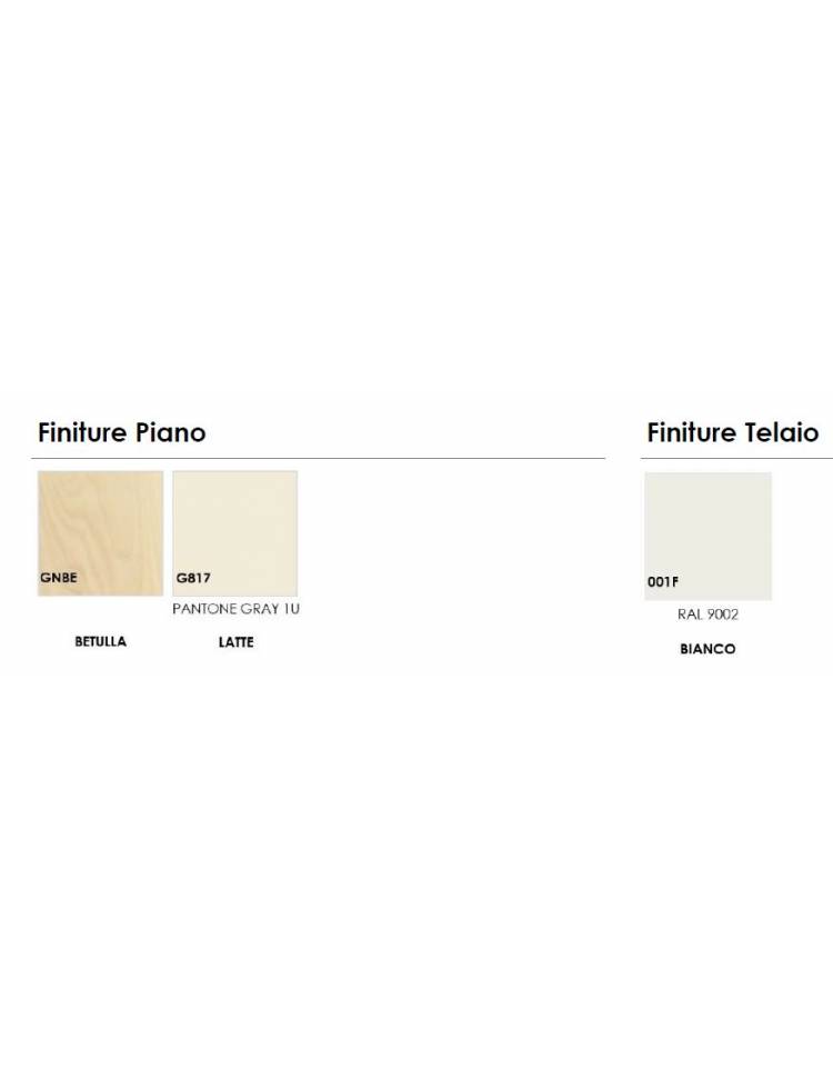 Il piano del tavolo deve essere posizionato perfettamente a filo della struttura metallica e non è consentito l’utilizzo di gambe fissate direttamente al piano del tavolo. Il piano del tavolo è realizzato in pannello di nobilitato ecologico certificato FSC, in classe E1 di emissione di formaldeide da mm 18 di spessore, la finitura del piano è in betulla naturale o latte tinta unita, i bordi sono realizzati in Abs da mm 2 di spessore, in tinta con la finitura del piano e arrotondati nel rispetto della normativa di sicurezza vigente. La struttura portante è realizzata con 4 gambe in profilo di acciaio a sezione quadrata da mm 40x40x1,5 di spessore, le gambe sono collegate fra loro con 2 profili di acciaio a sezione rettangolare da mm 25x15x1,5 di spessore. Le 2 strutture a ponte vengono poi collegate fra loro con ulteriori 2 profili di acciaio a sezione rettangolare da mm 25x15x1,5 di spessore a creare una solidissima ma leggera struttura di sostegno del tavolo. I vari elementi strutturali in acciaio sono saldati fra di loro, le saldature sono realizzate a filo continuo. Tutte le parti strutturali in acciaio sono verniciate a polveri epossidiche previo trattamento di sgrassaggio e fosfatazione con passaggio in tunnel termico a 180°. Il fissaggio del piano alla struttura portante avviene mediante speciali viti ad ala larga con testa incassata in un idoneo incavo ricavato sulla parete del tubo. Le 4 gambe sono dotate alla base di puntali inestraibili in materiale plastico antisdrucciolo e dotate di piedino regolabile in altezza che consente di collocare il tavolo perfettamente complanare al pavimento anche nel caso che quest’ultimo presenti una superficie non perfettamente livellato.