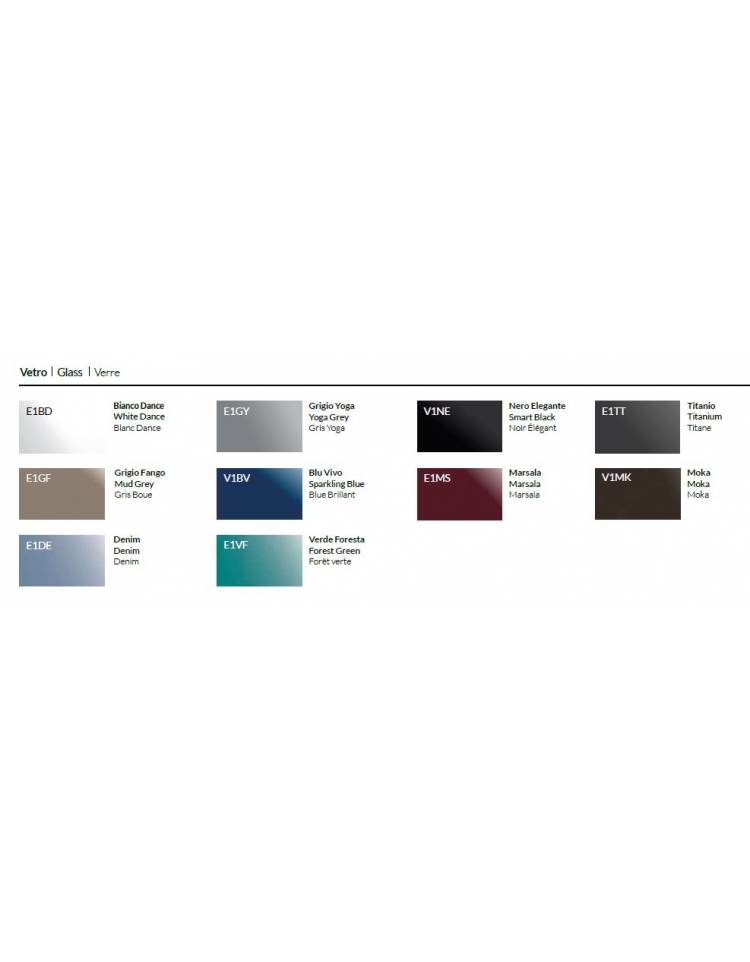 Realizzato in vetro temperato retro-laccato sp.10mm con bordi perimetrali lavorati a filo lucido, fissati alla struttura tramite ventose. Disponibile in 10 colori.