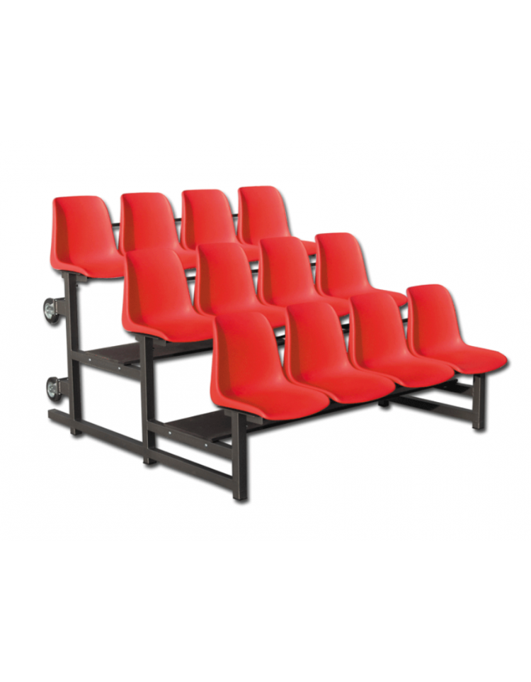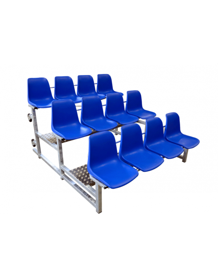 Tribuna fissa per esterno con struttura di acciaio zincato, sedute in polipropilene, corridoi e scale di accesso secondo normativa.