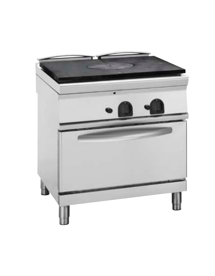 Top tuttapiastra a gas, per uso professionale. Piano di cottura con ampia piastra radiante in acciaio di spessore 15 mm. Versioni con e senza fuochi. Fuochi con accensione a mezzo fiamma pilota, rubinetti con valvola di sicurezza e termocoppia. Bruciatori a fiamma modulante, griglie in ghisa o in tondino acciaio inox, con bacinelle di raccolta liquidi estraibili. Bruciatore tuttapiastra dotato di accensione piezoelettrica. Scarico fumi sul retro, realizzato completamente in sicurezza.