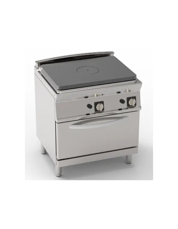 Piastre di cottura realizzate in acciaio dolce spessore 15 mm,poggianti sulla camera dei bruciatori senza contatto con il piano di lavoro per garantire un'efficace interruzione del ponte termico - Camera alloggiamento bruciatori realizzata interamente in acciaio ino AISI 430 e coibentata sul perimetro - Bruciatore tubolare a più elementi in acciaio cromato - Rubinetti gas in sicurezza con termocoppia e spia pilota - Accensione di tipo elettronico con alimentazione a pila da 1,5 V -Struttura autoportante in acciaio inox AISI 304 - Piedini regolabili in altezza (15/20 Cm) - Potenza piastra Kw 7 e potenza forno Kw 5