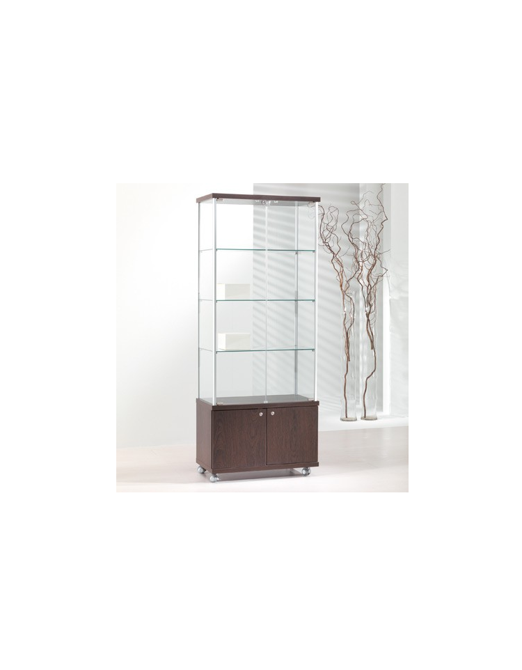 Vetrina con profili in alluminio – cristalli temperati – no. 2 ante battenti con serratura – no. 3 ripiani regolabili in altezza – top legno – mobile legno h 43 cm con ante battenti e serratura – su ruote.