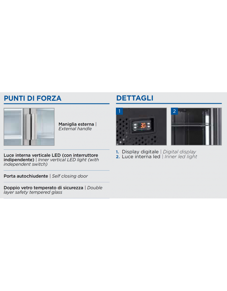 Il modello è stato progettato per essere una vetrina refrigerata per bevande affidabile e versatile, ideale per esporre e mantenere alla giusta temperatura qualsiasi tipo di bottiglia e lattina. Con una capacità di 1200L, di colore bianco e con maniglia esterna quadrata in alluminio, questo prodotto è equipaggiato con luce LED verticale interna con interruttore indipendente, serratura, display digitale, 4 ripiani regolabili, porta autochiudente e doppio vetro temperato di sicurezza.