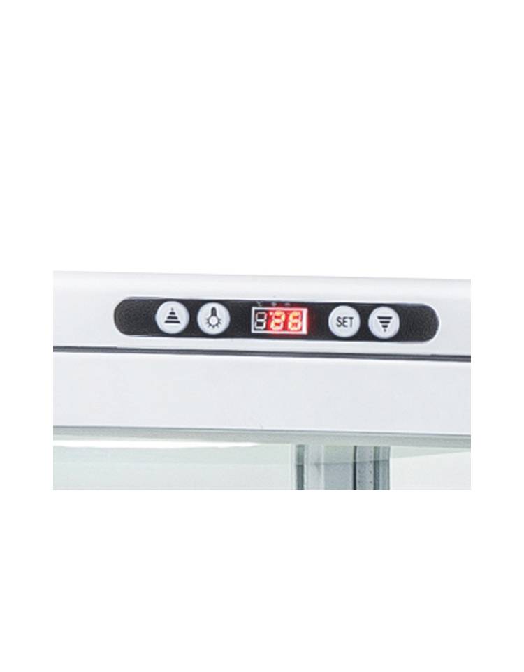 Vetrina refrigerata da banco di colore bianco con vetro dritto, equipaggiata con display digitale per il controllo della temperatura, luci interne a LED e ripiani regolabili di colore bianco.