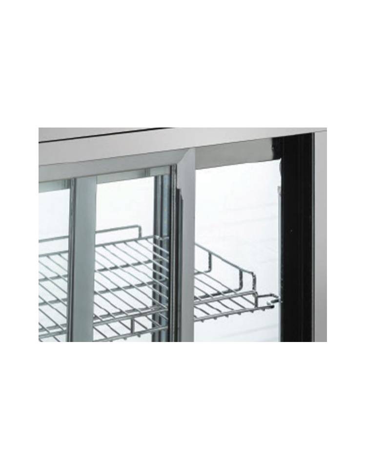 Vetrina refrigerata da banco con vetro dritto e struttura in acciaio, equipaggiata con luci LED, doppio vetro anti condensa, sportelli posteriori scorrevoli e ripiani regolabili cromati. Il modello è stato progettato per l’esposizione di qualsiasi alimento meriti la giusta visibilità sul tuo bancone.