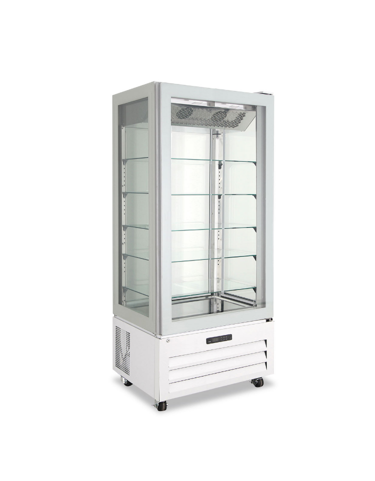 La vetrina per pasticceria riesce a catturare lo sguardo del visitatore grazie alla sua raffinatezza, e allo stesso tempo è in grado di adattarsi a qualsiasi contesto grazie alla sua discrezione.Questo modello con porta singola da 900mm, è disegnato per valorizzare i prodotti esposti al suo interno grazie ai 4 lati in vetro panoramico con serigrafia nera, ai 5 ripiani in vetro ed alle 4 luci interne a LED.In classe energetica A, dotata di termostato digitale con connessione Wi-Fi che consente di monitorare e regolare la temperatura interna da smartphone o tablet.