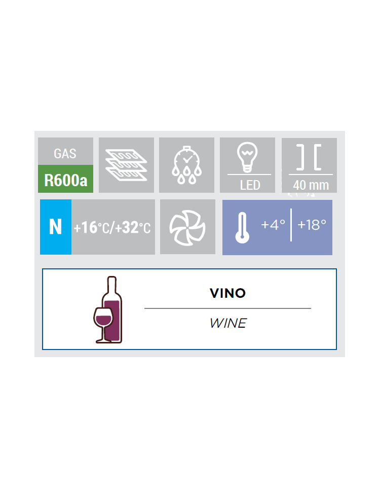 Il modello è una moderna cantinetta mono temperatura adatta a contenere fino a 28 bottiglie, adatta anche per uso domestico, equipaggiata con 6 ripiani cromati, 1 cestello cromato, luce interna a led, porta reversibile, vetro trasparente e maniglia integrata nel profilo della porta.