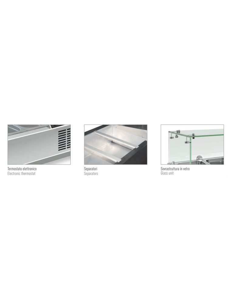 Vetrina refrigerata pizzeria statica +2°/+8°C in acciaio inox AISI 304 con vetro superiore- 8 bacinelle GN1/3 -cm 180x39,5x43,5h