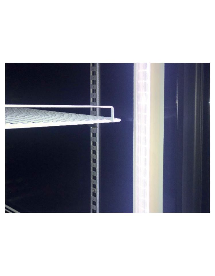 Il modello è stato progettato per essere una vetrina refrigerata per bevande affidabile e versatile, ideale per esporre e mantenere alla giusta temperatura qualsiasi tipo di bottiglia e lattina. Con una capacità di 300L, di colore nero e con maniglia integrata nel profilo della porta, questo prodotto è equipaggiato con luce LED verticale con interruttore indipendente, 4 ripiani regolabili di colore bianco e doppio vetro temperato di sicurezza.